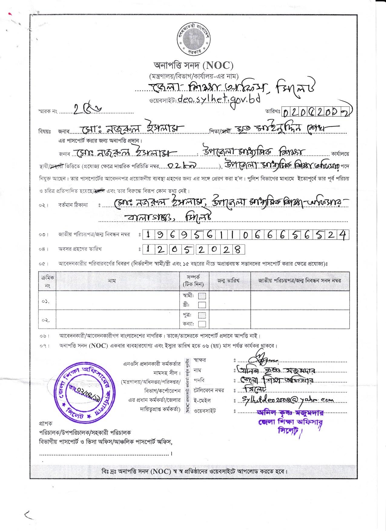 NOC of Mr. Md. Nazrul Islam, Upazilla Secondary Education Officer, Balagonj, Sylhet